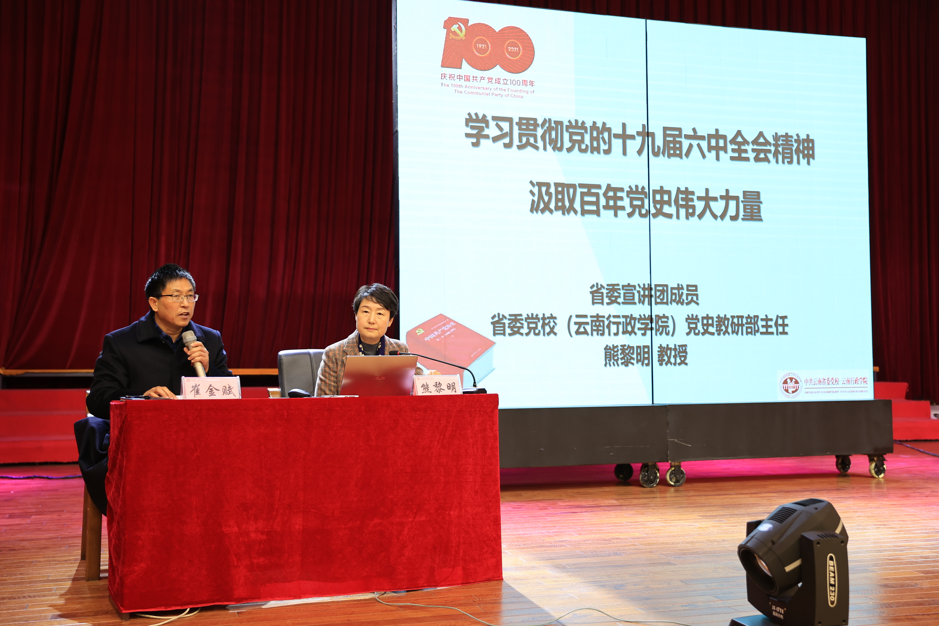 通知中心12月22日下午,根据省委教育工委统一安排部署,学院邀请省委宣讲团成员、省委党校(云南行政学院)党史教研部主任熊黎明教授到校,在小哨校区蚕桑礼堂举行学习贯彻党的十九届六中全会精神宣讲报告会。学院党政领导、师生代表共600余人参加,报告会由学院党委书记崔金赋同志主持。