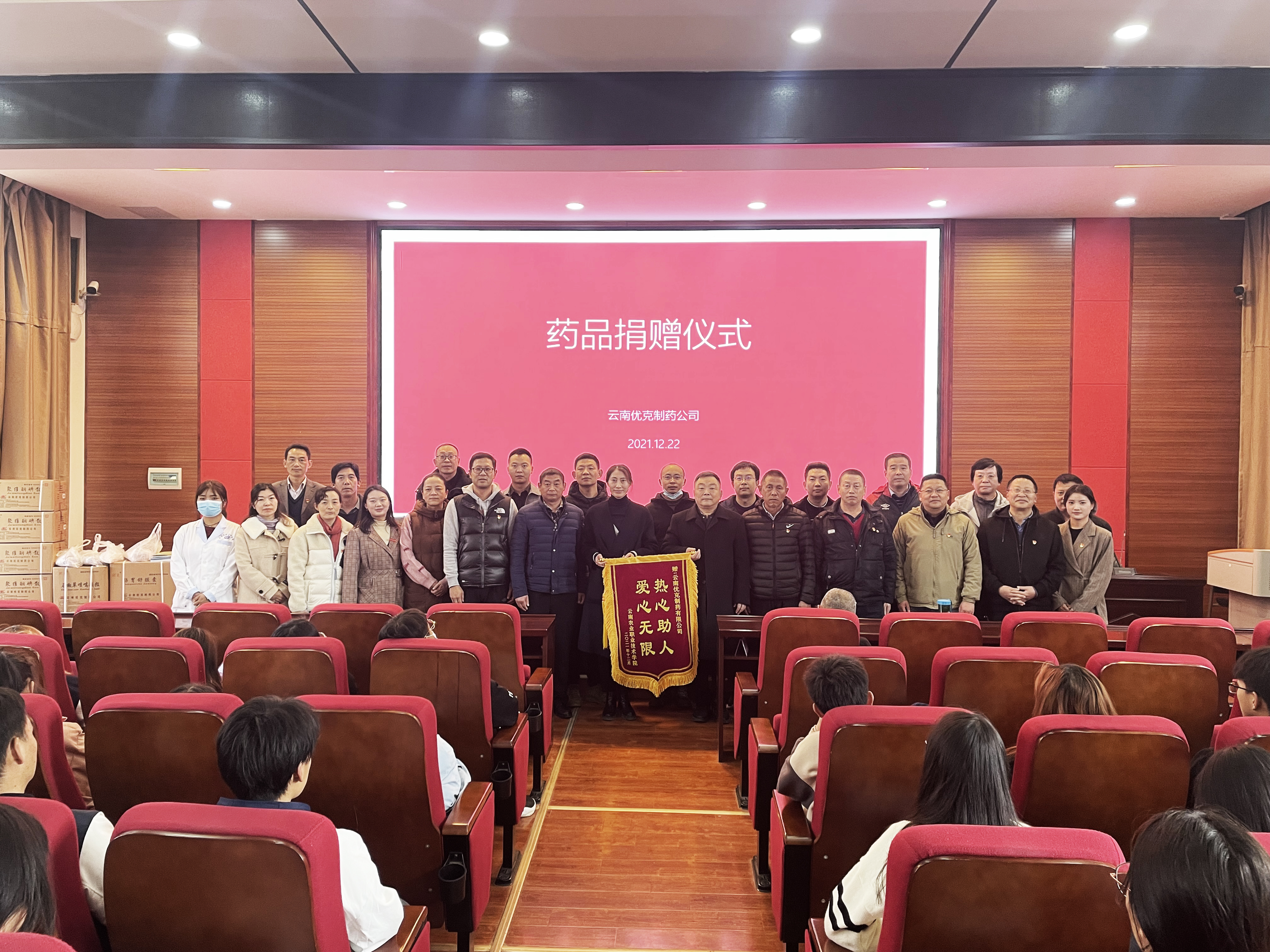 12月22日下午,在小哨校区嘉锐楼阶梯教室举办了为师生办实事药品捐赠活动。云南优克制药有限公司总经理唐秋海、办公室主任季春燕,后勤基建党支部、办公室(党委巡查办)党支部全体党员、师生代表等300余人参加捐赠仪式。