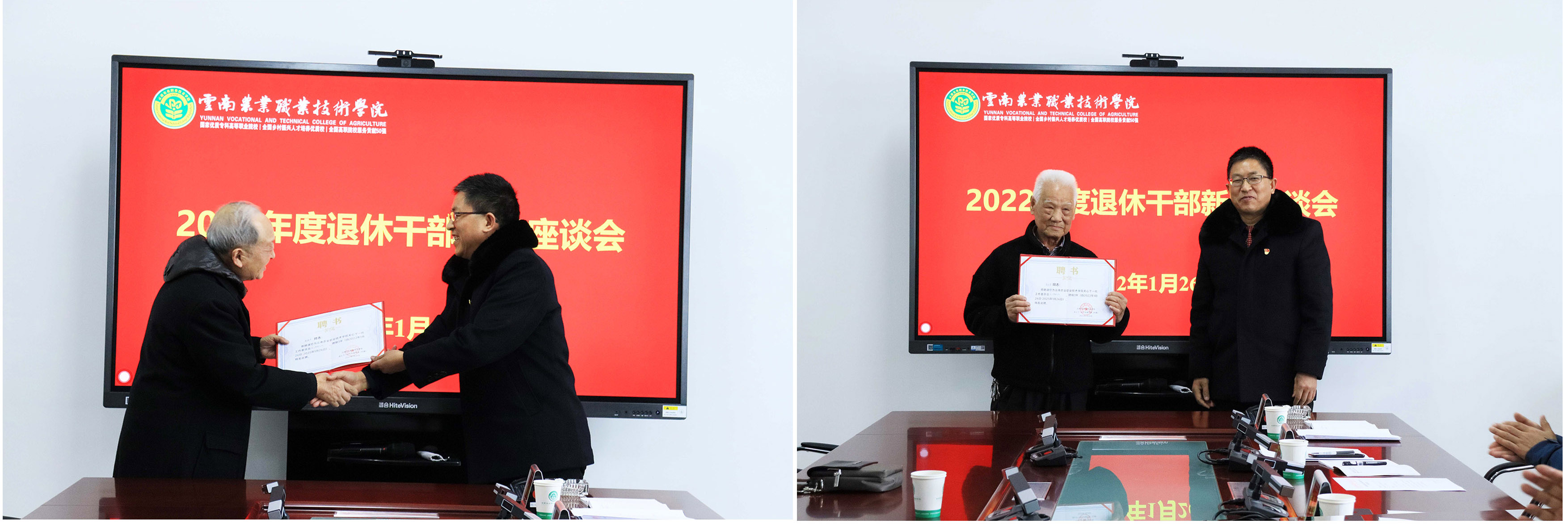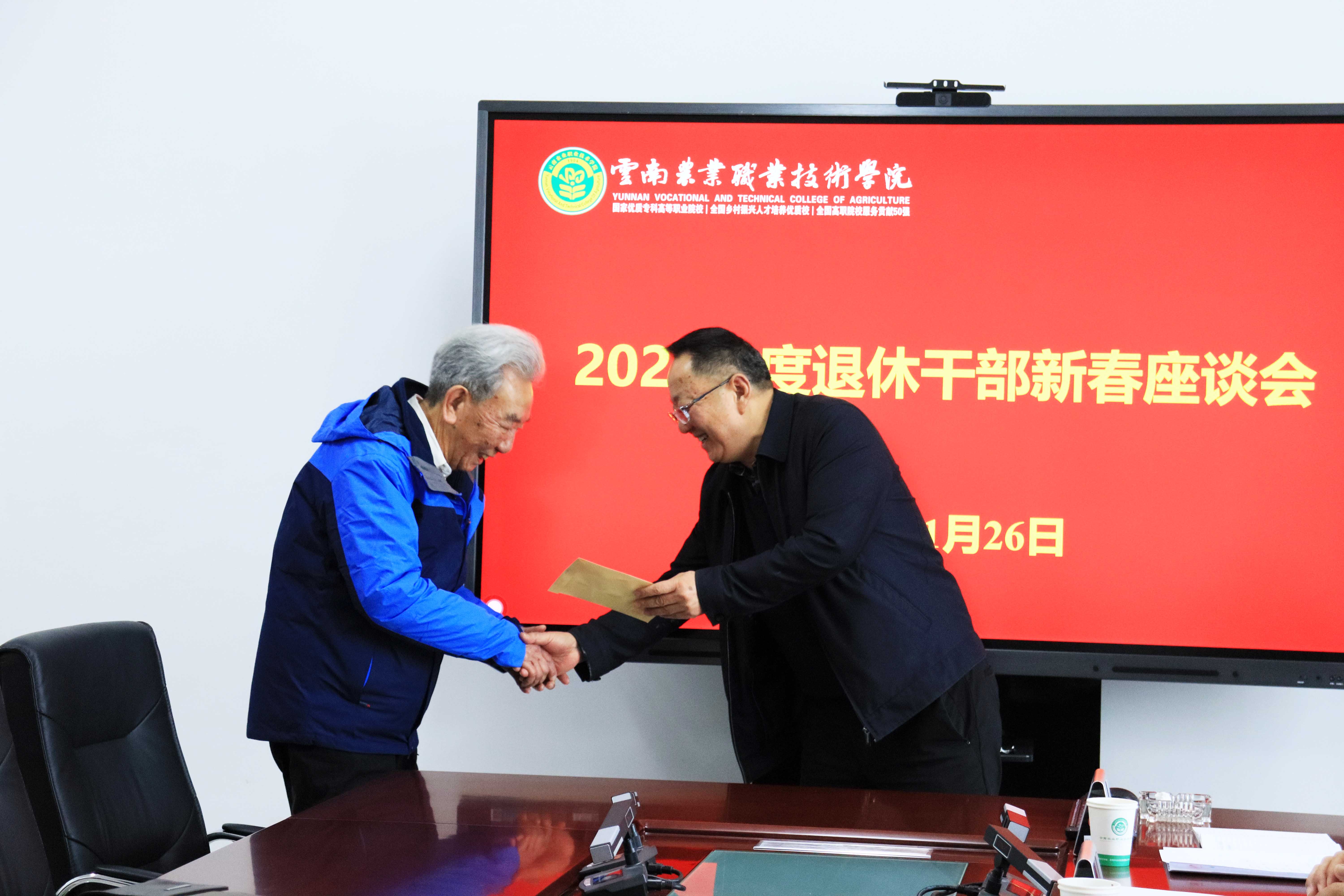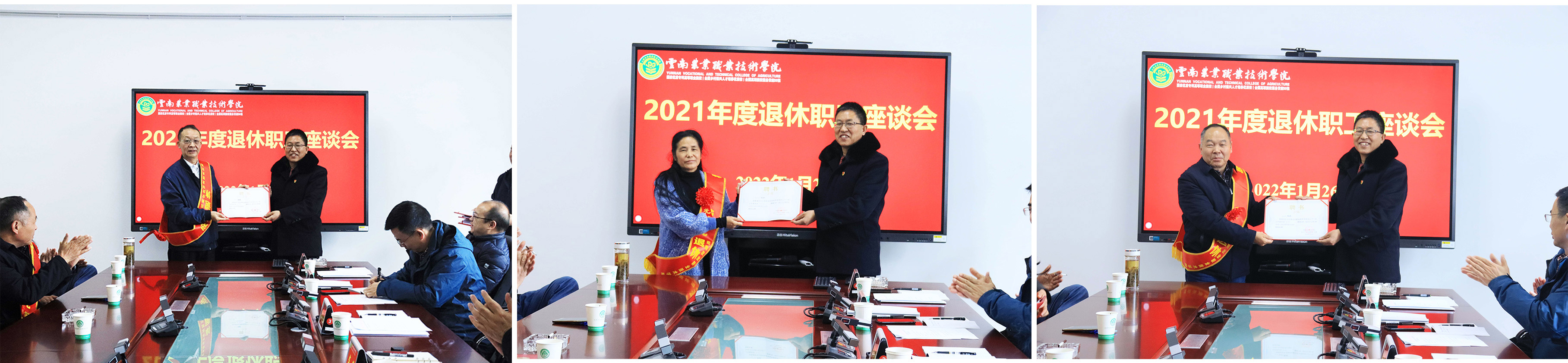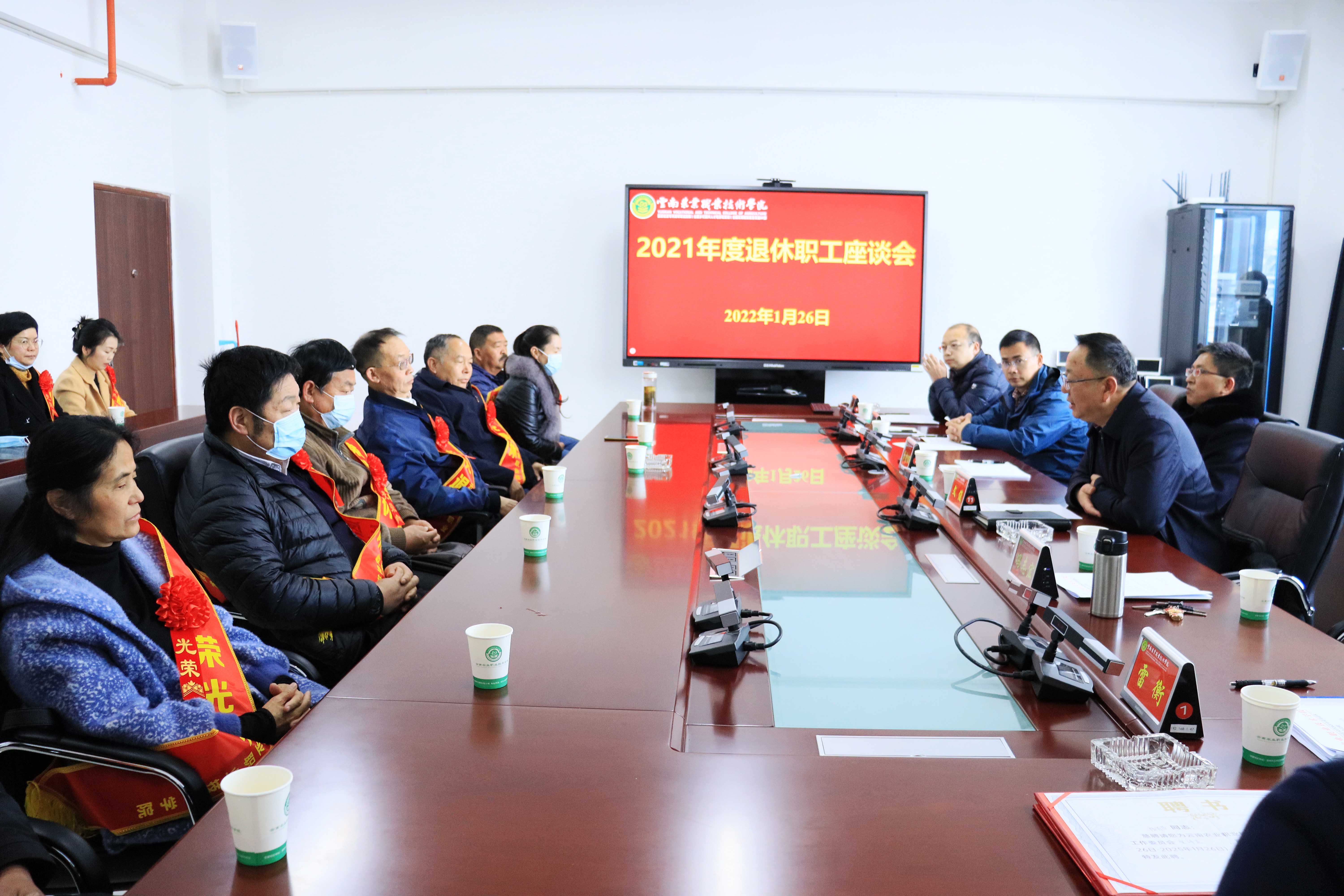 1月26日,学院在茭菱校区办公楼826会议室分别召开2021年度退休职工座谈会和已退休正职领导干部座谈会。座谈会上,文俊院长从办学规模、二级学院设置、专业建设、办学质量、就业状况、取得的成效和发展思路等方面对学院的基本情况进行了简要介绍;与会人员进行交流座谈,他们纷纷回顾自己在岗期间的工作经历,对学院事业发展蒸蒸日上感到欣慰,并对学院事业的发展建言献策。学院领导分别为2021年荣光退休人员和已退休正职领导干部发放关工委聘书及纪念品。党委书记崔金赋在座谈会上向大家致以诚挚的节日问候和美好祝福,并表示学院今天的发展成就凝聚着老一辈农职人的心血与汗水,衷心希望老同志一如既往关心支持学校发展。