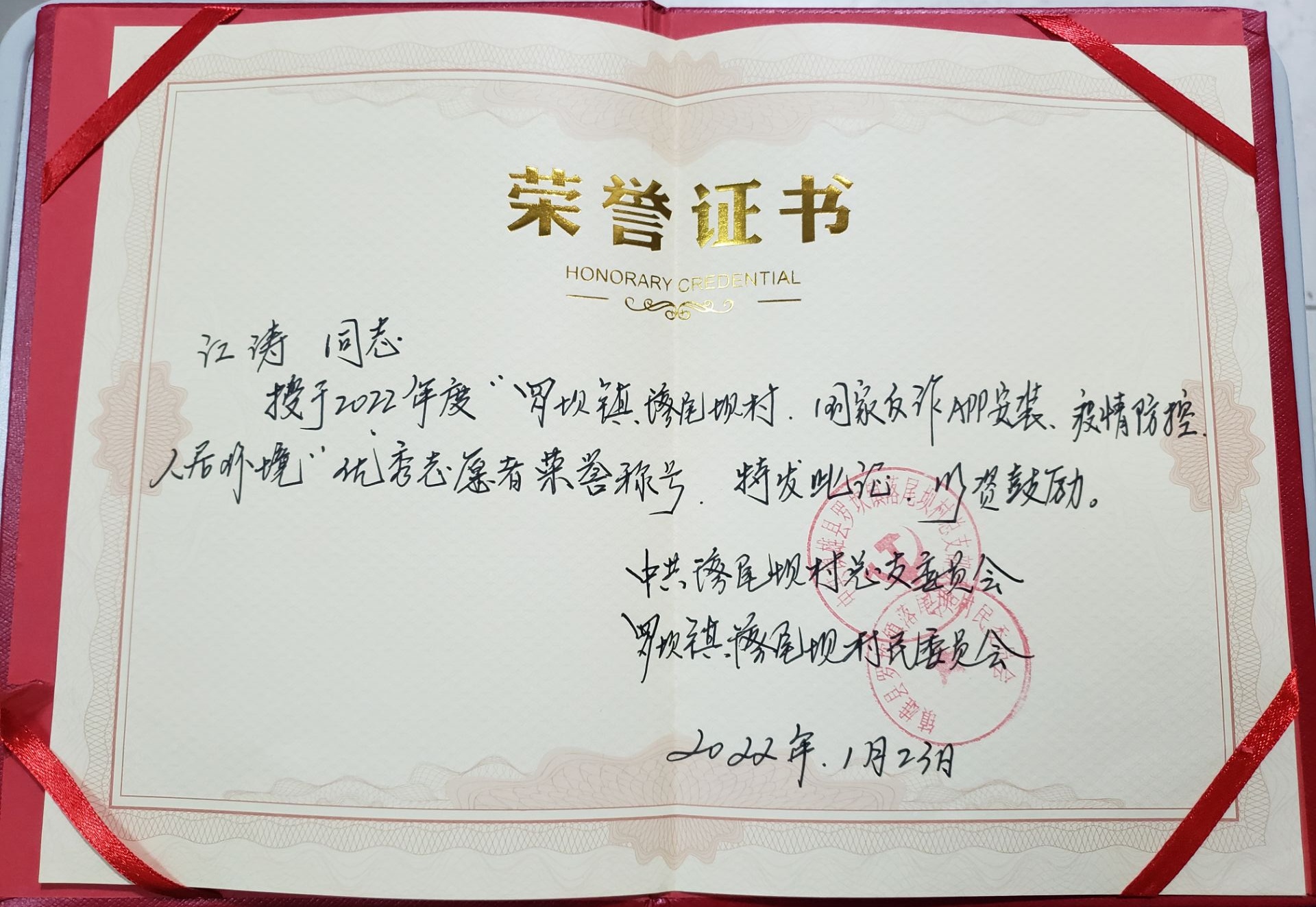 在公益劳动、志愿服务方面,学生参与性极强。其中,21级计算机应用技术一班江涛同学参与了国家防诈APP安装、疫情防控、人居环境整治志愿者服务,因表现突出被镇雄县罗坎镇落尾村授予了优秀志愿者荣誉称号。